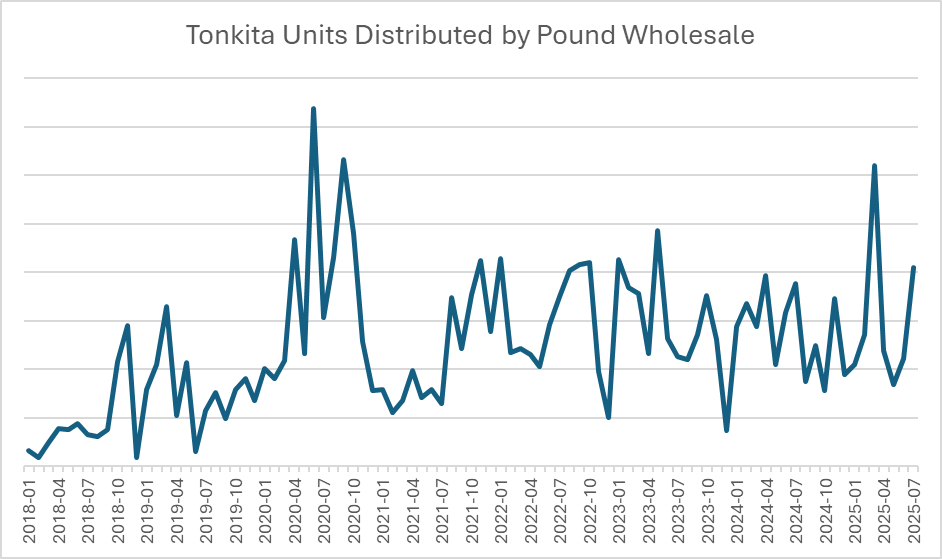 Pound Wholesale’s data supports the notion that Tonkita has consistently improved since the range was added in 2018, with fewer low-sales months. Though Tonkita appears to be an uncommon choice in December each year, the data indicates that Tonkita is a trusted choice for Spring clean, with sales appearing to boom in late Q1, early Q2 each year.