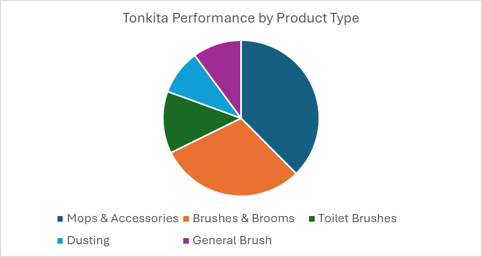 Unsurprisingly, Tonkita’s most popular product ranges with wholesale customers are their most populated and common ranges; Mops & Floor Brushes. However, the chart indicates strong performance across all Tonkita’s cleaning products, demonstrating their widespread popularity across Pound Wholesale’s customer bases.