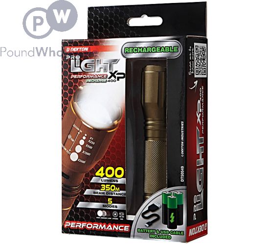 The effective Dekton Pro Light XP400 Rechargeable Performance Torch features 5 output modes. With adjustable beam focus, walkers, cyclists and orienteers can charge the device's batteries in the car or from the laptop.