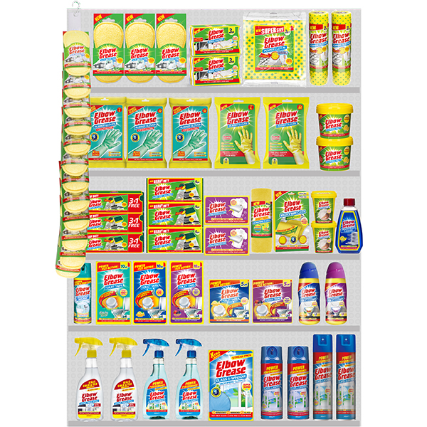 With immense cleaning power to complete your range, the Elbow Grease Planogram contains all of their essential scouring pads, wipes and anti-bacterial scourers for cleaning stubborn stains and wiping messes around the home and kitchen.