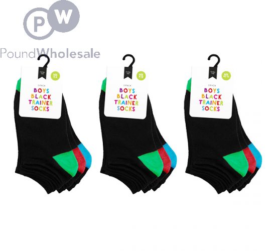 The Farley Mill Boys Black Trainer Socks have assorted solid colour heels, with three pairs per pack.