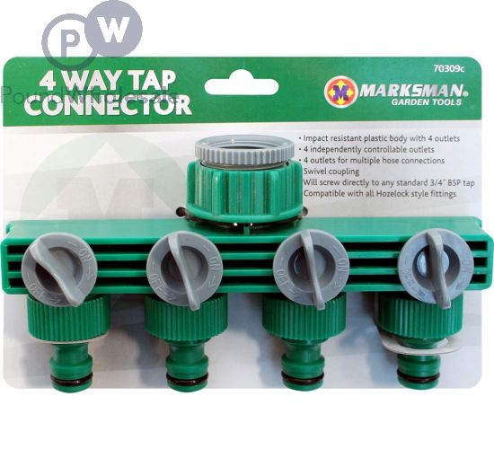 With four outlets, the Marksman 4 Way Tap Connector is suitable for multiple hose connections, with independent control per outlet. Screwing directly into any standard 3/4" BSP tap, the 4 Way Tap Connector is compatible with all hozelock style fittings.