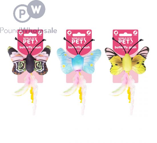 The World Of Pets Butterfly Cat Toy includes three elegant, vibrant assorted designs. With a fluttery super-soft polyester body, ribbon and feather tails to tempt and tease felines, the Butterfly Cat Toys encourage play and exercise.
